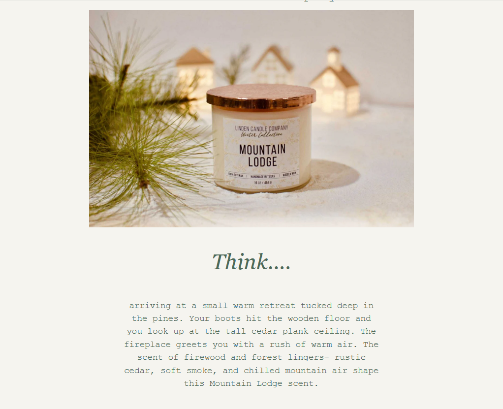 Imagine arriving at a small warm retreat tucked deep in the pines. Your boots hit the wooden floor and you look up at the tall cedar plank ceiling. The fireplace greets you with a rush of warm air. The scent of firewood and forest lingers- rustic cedar, soft smoke, and chilled mountain air shape this Mountain Lodge scent.
